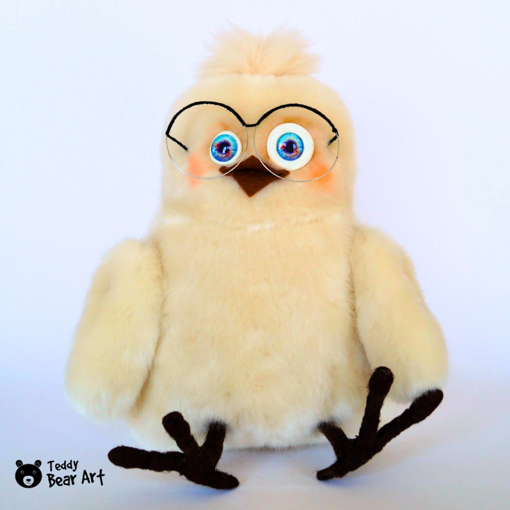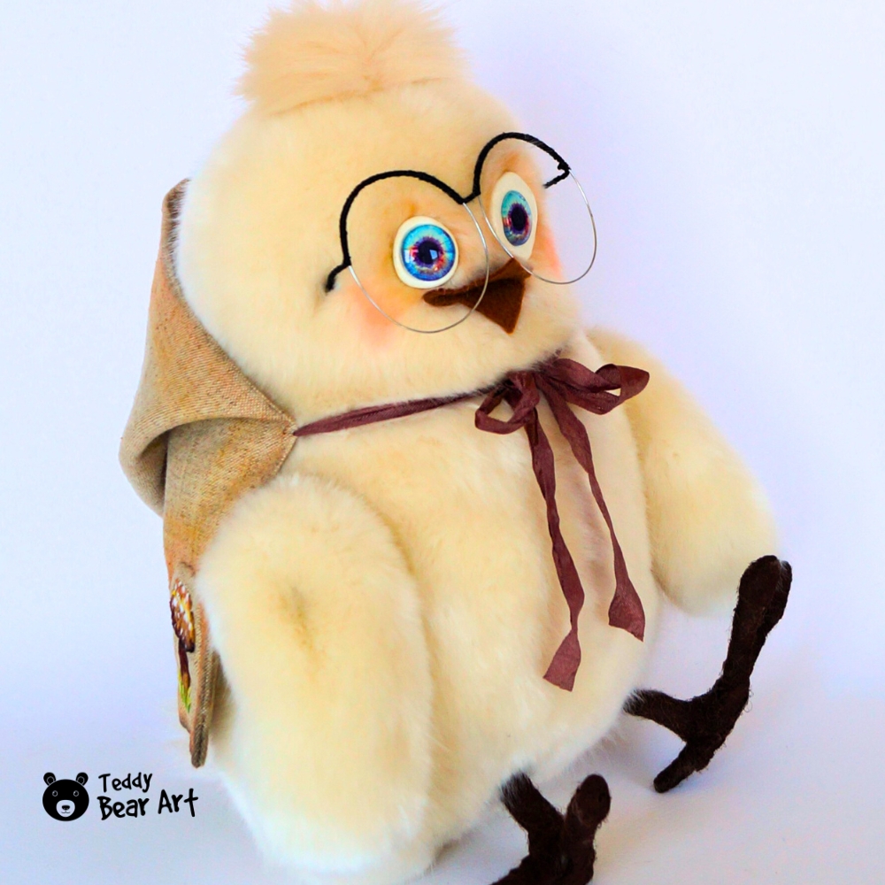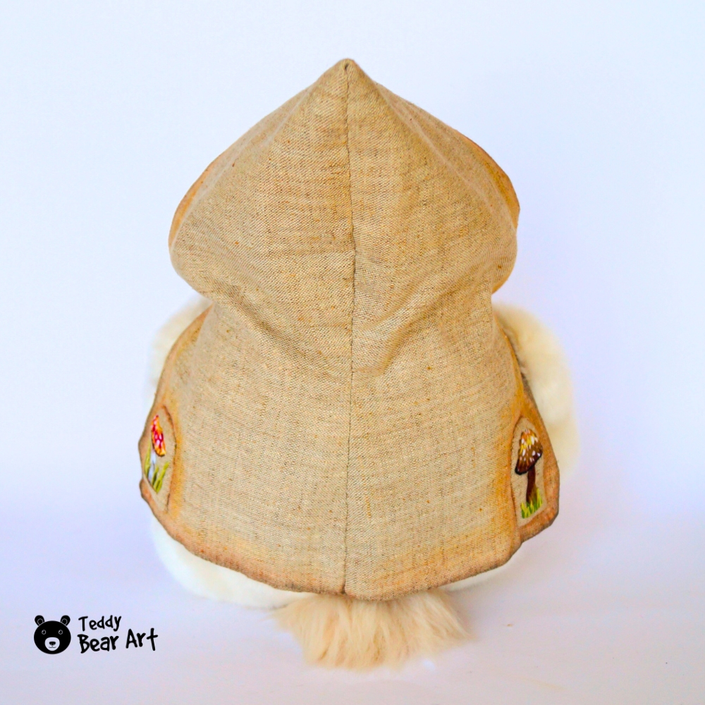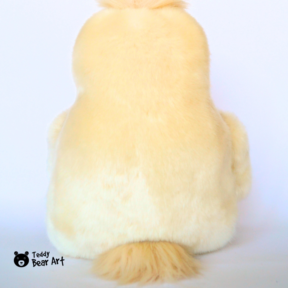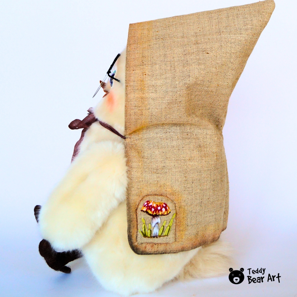 Materials: faux fur, polymer clay, glass eyes, synthetic filler, needlefelted legs, and metal weight. There are no joints.