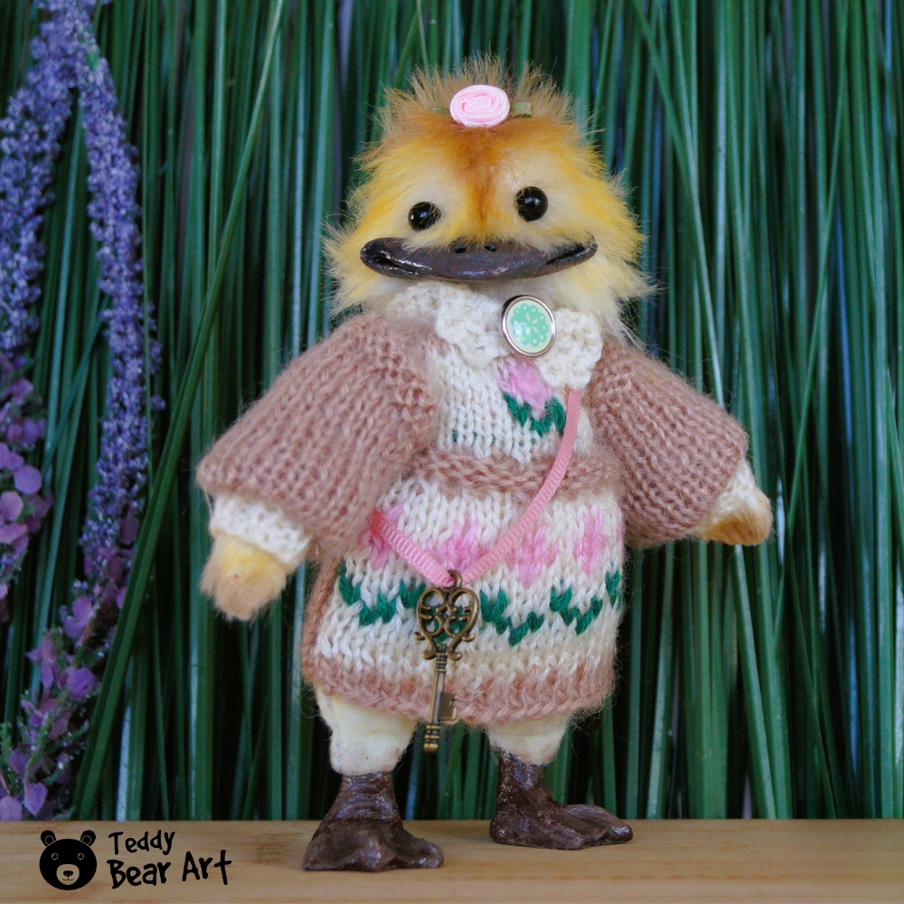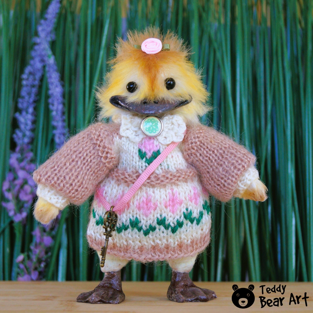 Materials: Quacktastic Duck Zoey is made from mohair and felt fabric. Filled with synthetic filler, and metal granules for weight. The Duck has bead eyes and 3 joints (the head and the arms). Her beak and legs are molded.