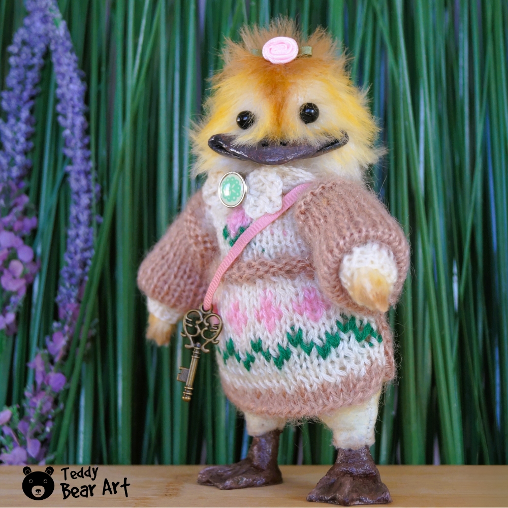 Materials: Quacktastic Duck Zoey is made from mohair and felt fabric. Filled with synthetic filler, and metal granules for weight. The Duck has bead eyes and 3 joints (the head and the arms). Her beak and legs are molded.