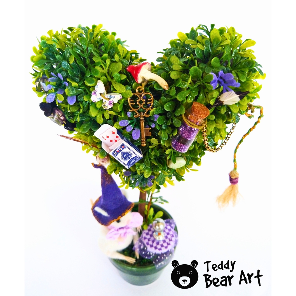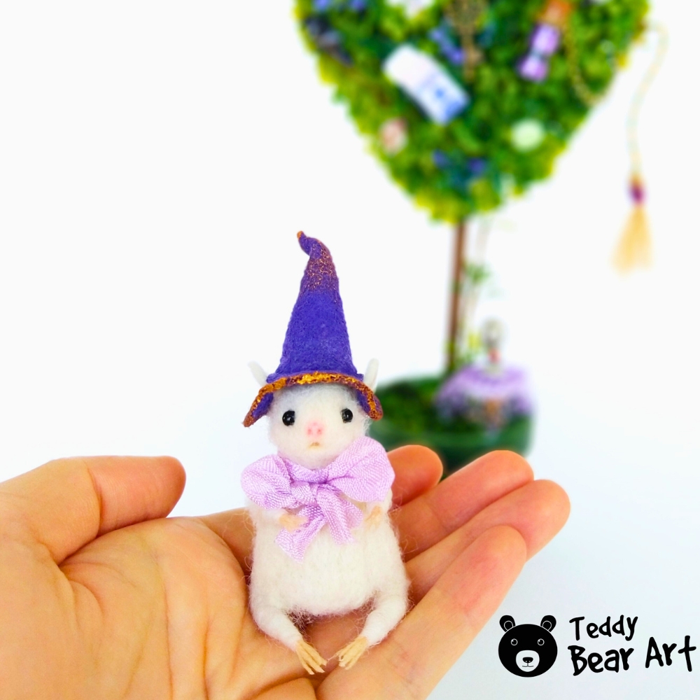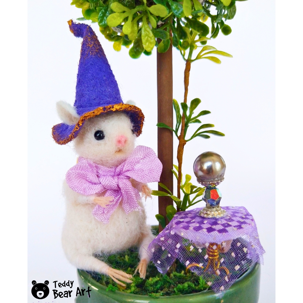 A needle-felted witch mouse under her magic tree. Each detail tells a story: a golden key, a vial of glitter, a tiny broom, and a crystal ball that keeps her secrets—a unique collectible full of charm and mystery.