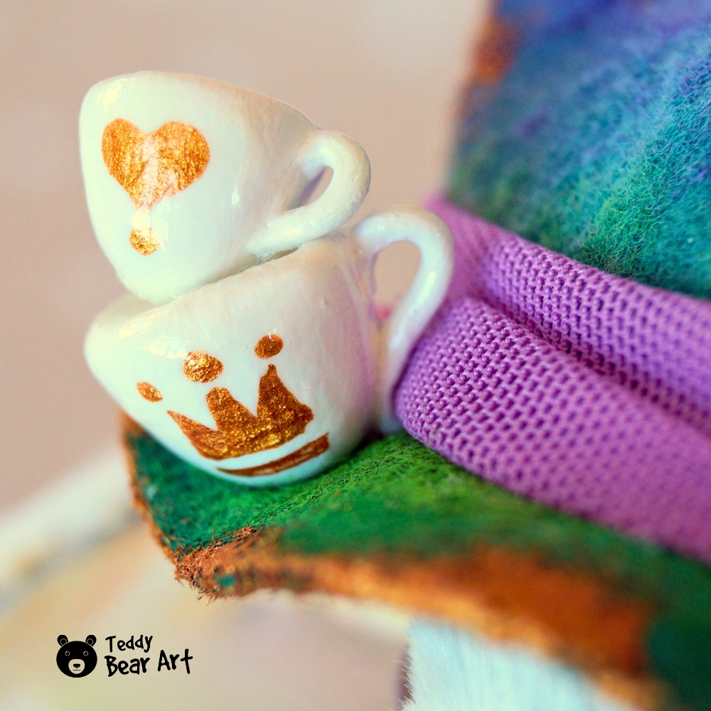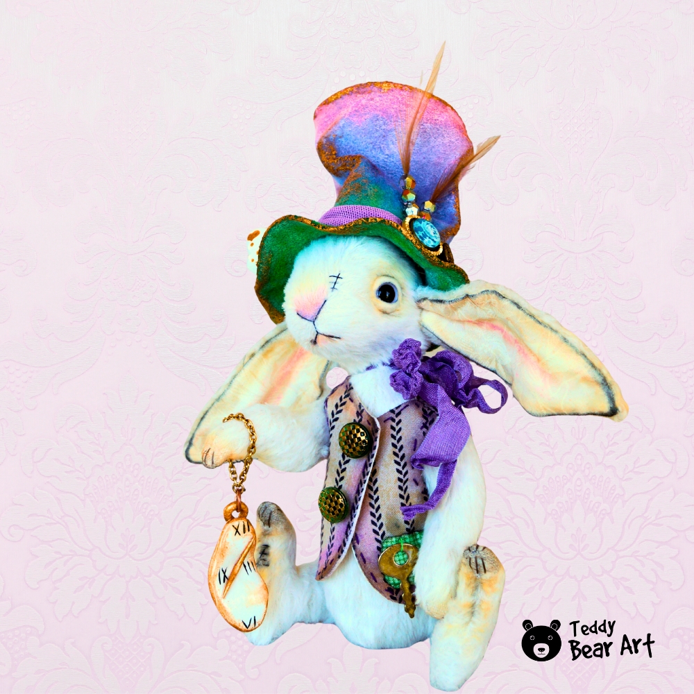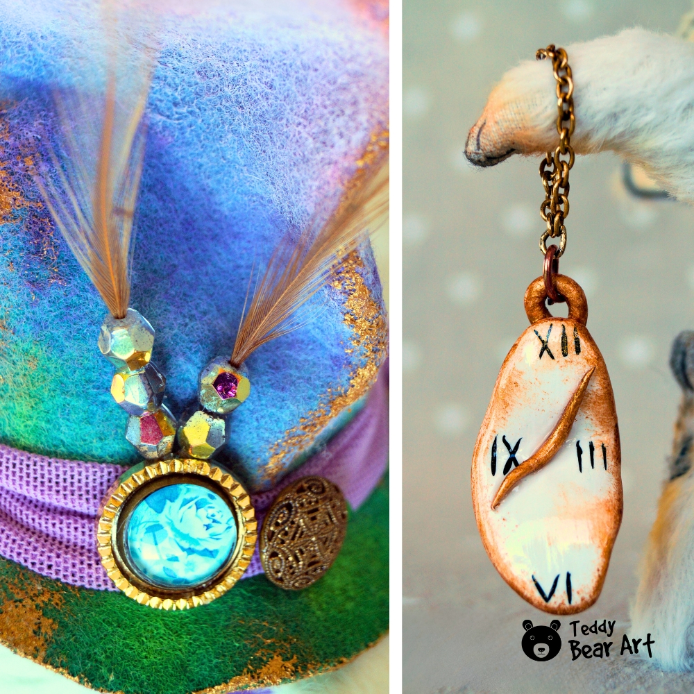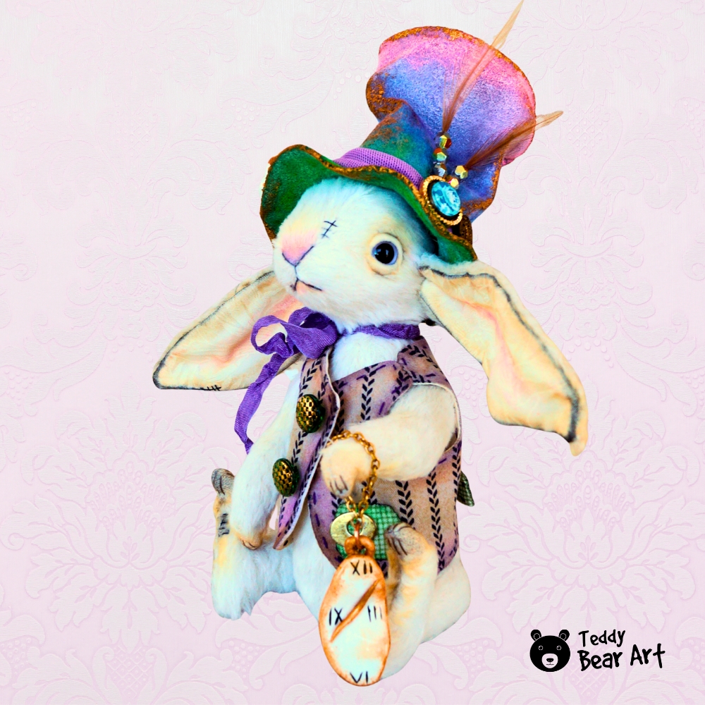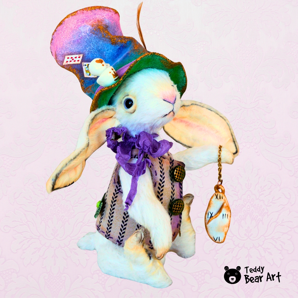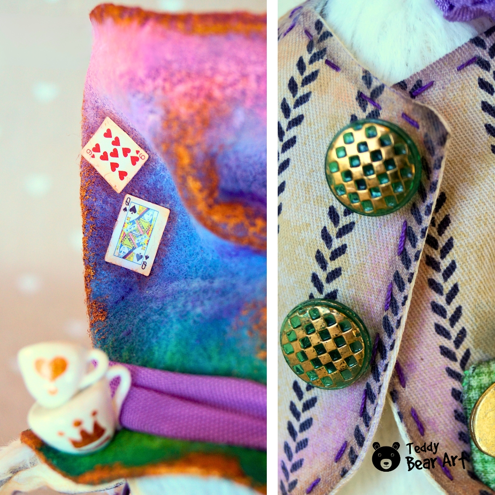 Materials: Viscose (Germany), glass eyes, wired ears, fiberfill, metal granules, cotton, and felt. 5 joints. Clothing and accessories can be removed.