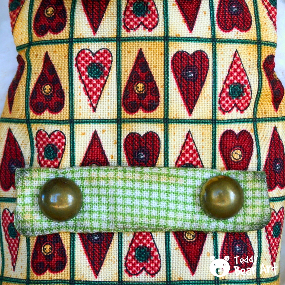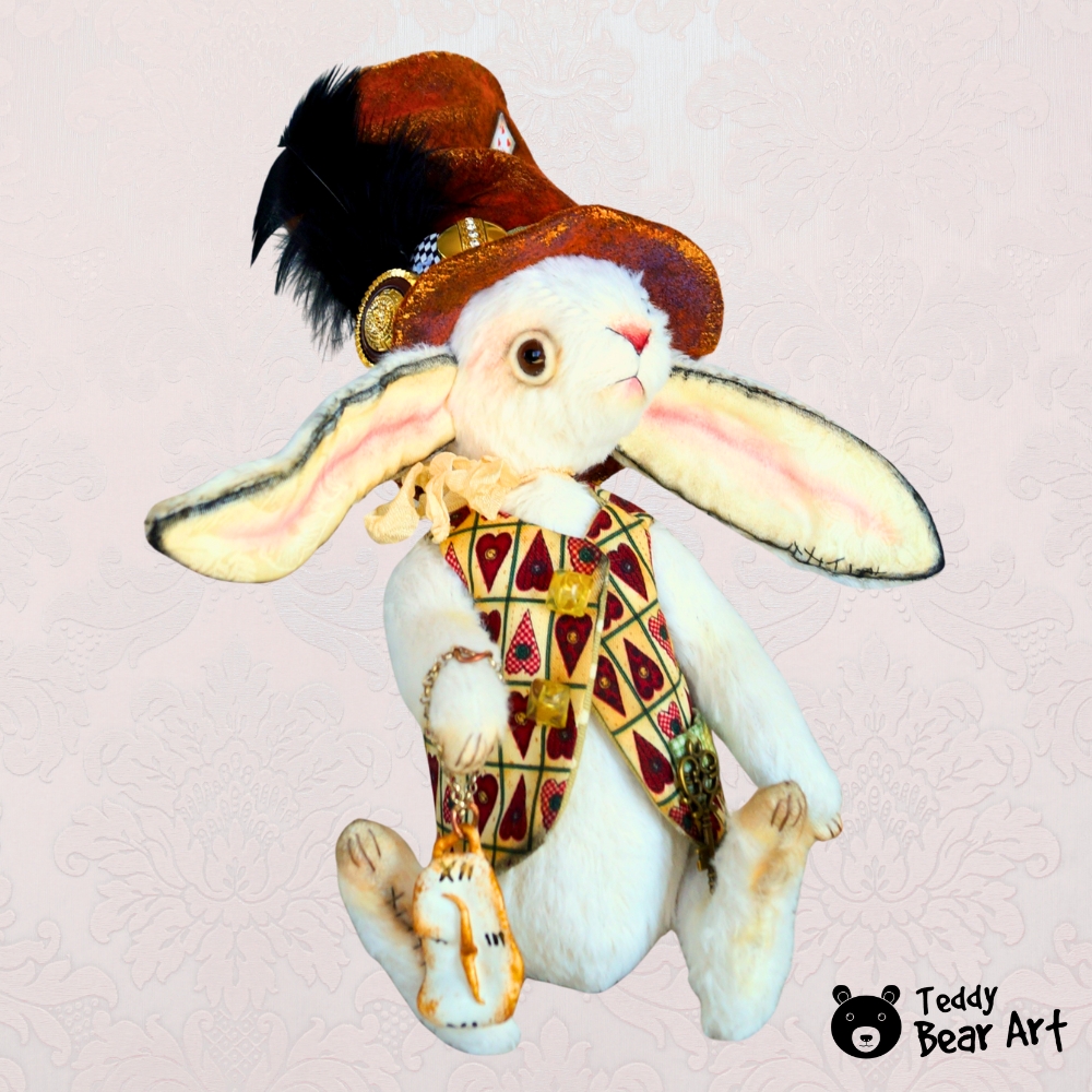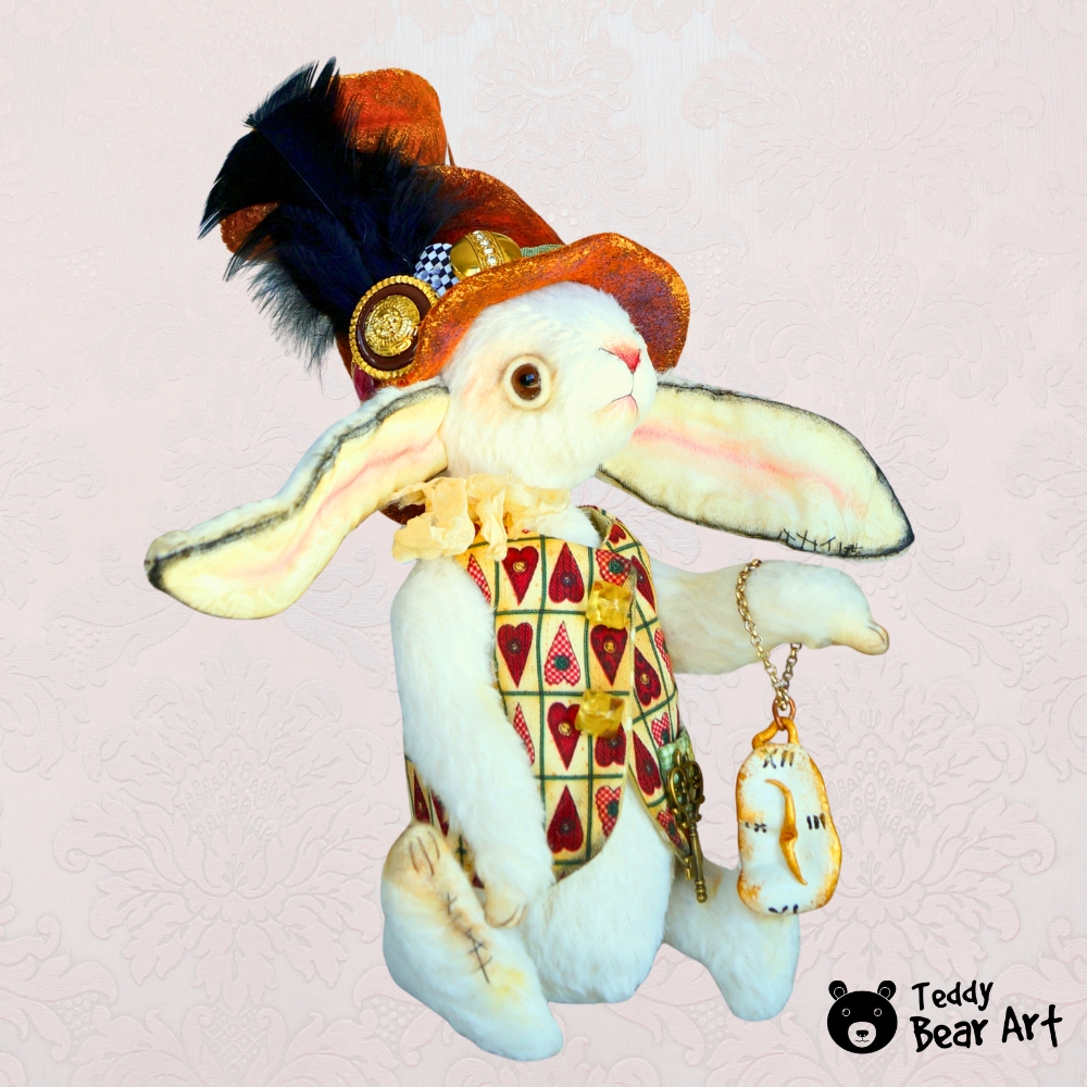 Materials: Viscose (Germany), glass eyes, wired ears, fiberfill, metal granules, cotton, and felt. 5 joints. Clothing and accessories can be removed.