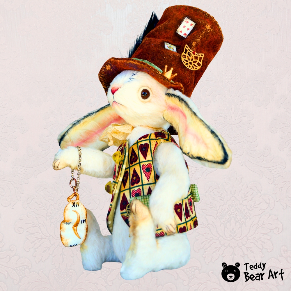 Materials: Viscose (Germany), glass eyes, wired ears, fiberfill, metal granules, cotton, and felt. 5 joints. Clothing and accessories can be removed.