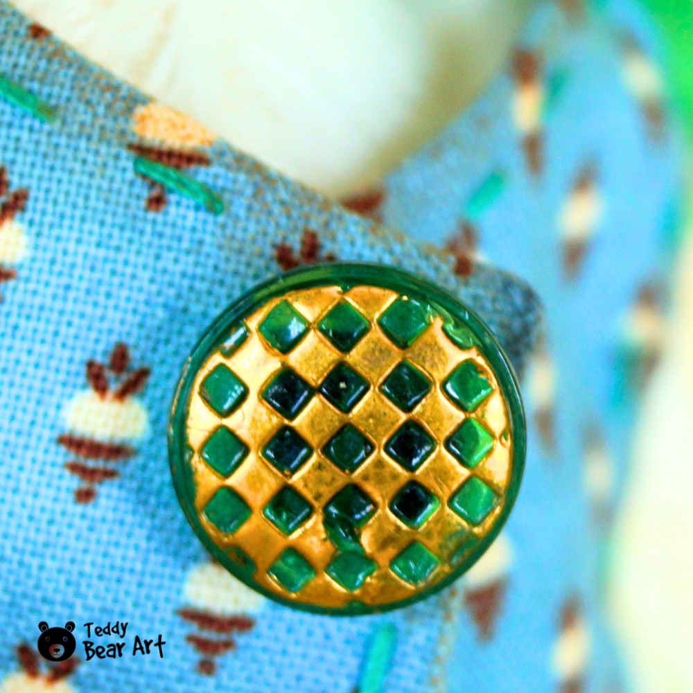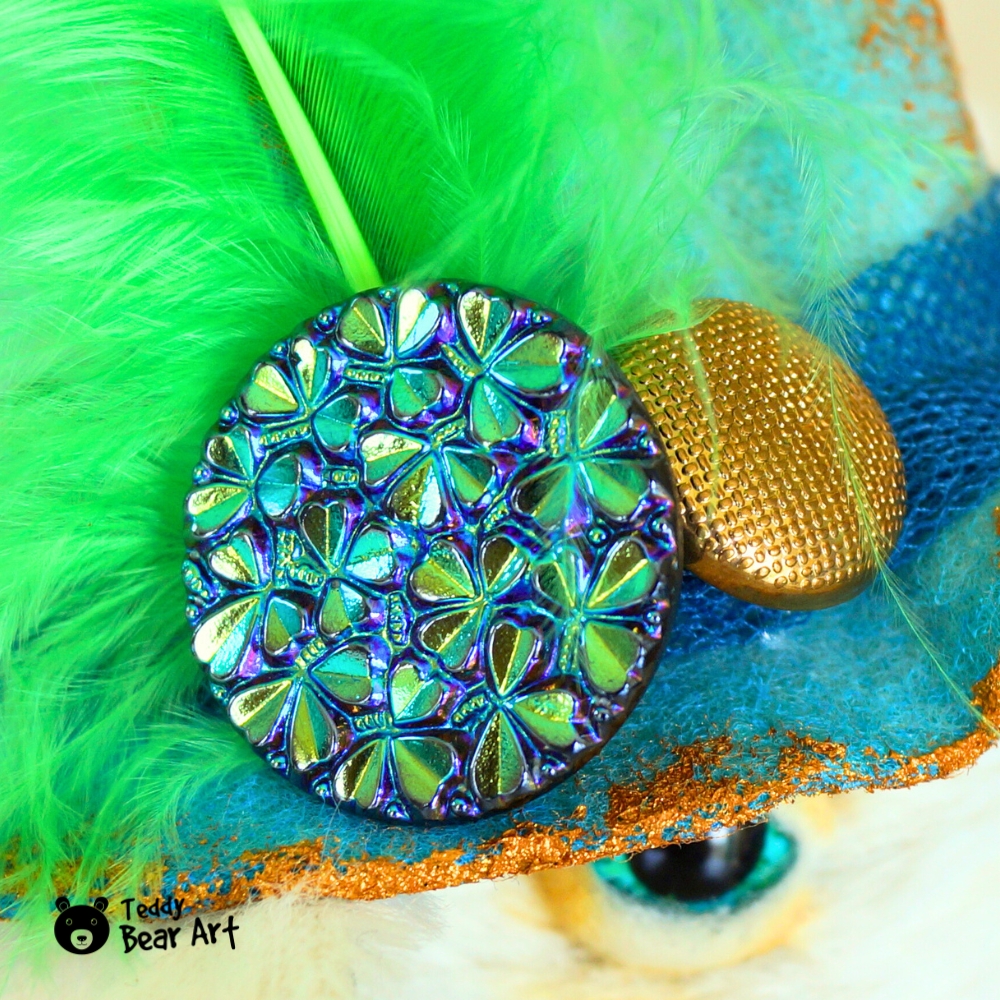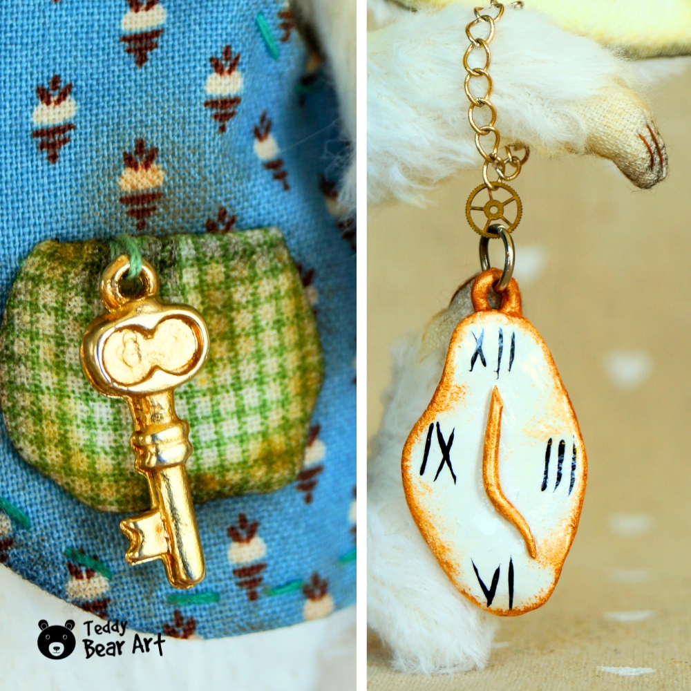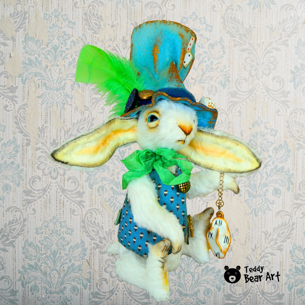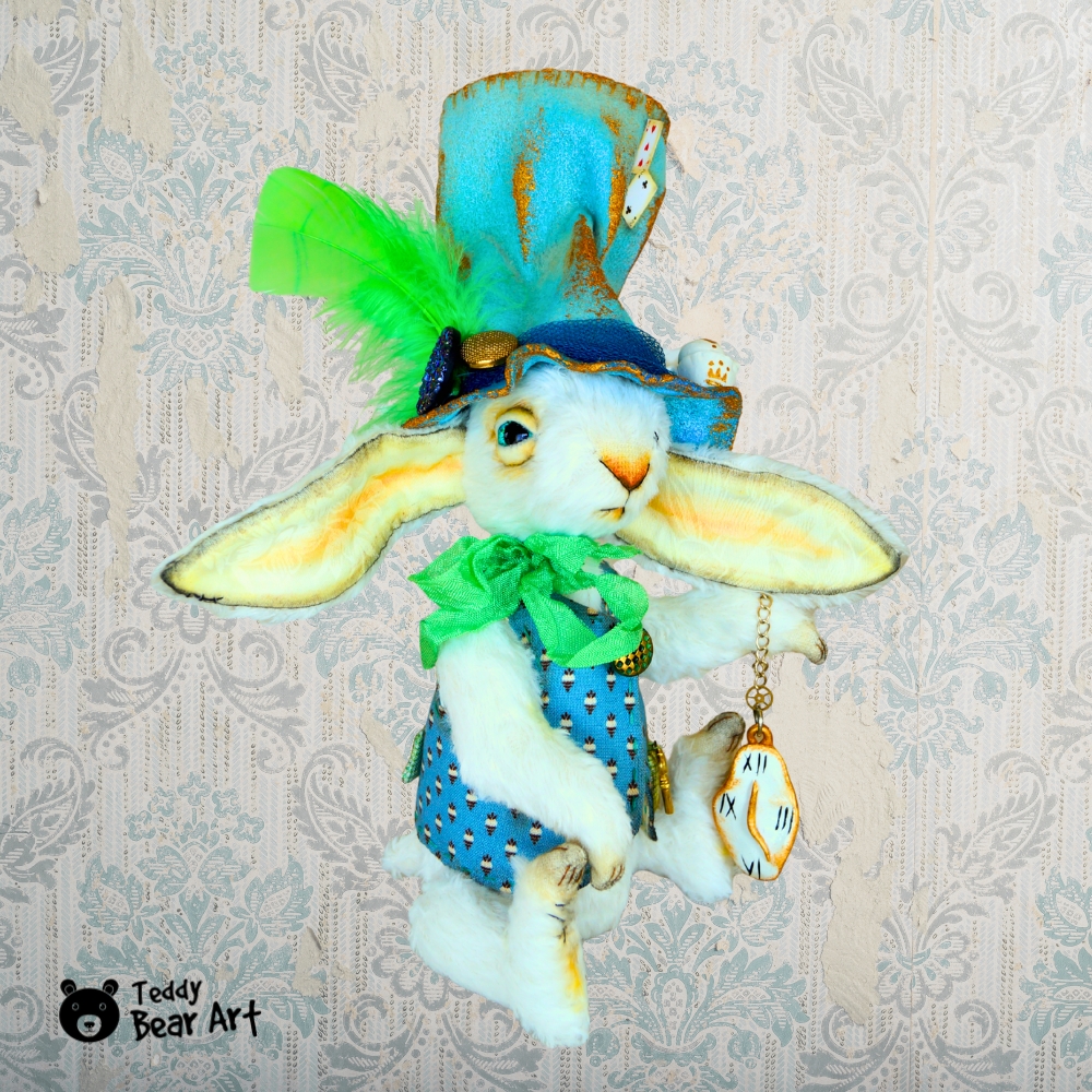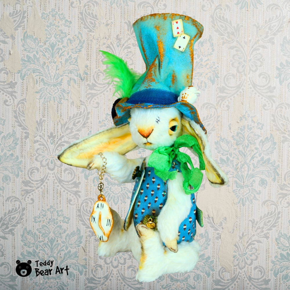 Materials: Viscose (Germany), glass eyes, wired ears, fiberfill, metal granules, cotton, and felt. 5 joints. Clothing and accessories can be removed.