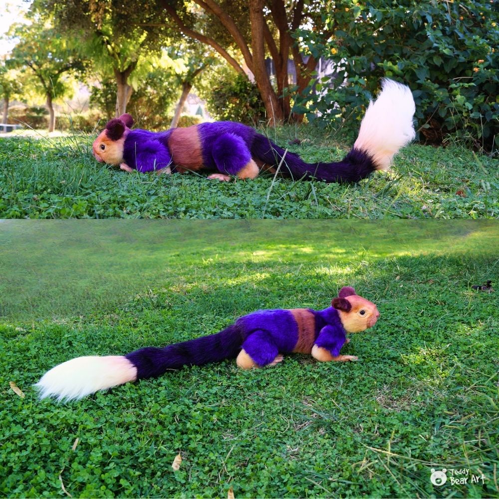 Materials: faux fur, glass eyes, synthetic filling, and metal weighting for perfect balance. Inside, the squirrel features a plastic skeleton running from head to tail, allowing gentle posing and movement. You can slightly turn or lift the head, and adjust the neck, body, and tail position.