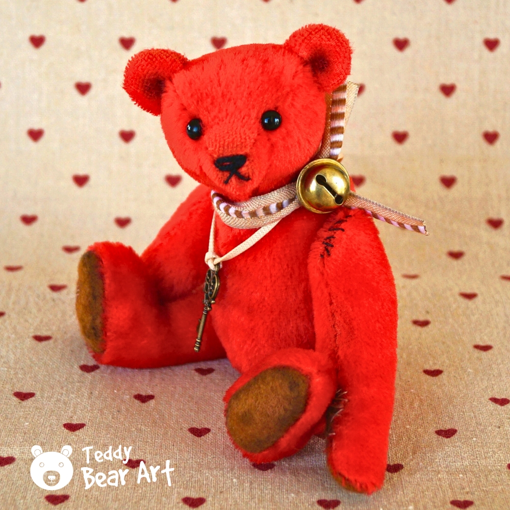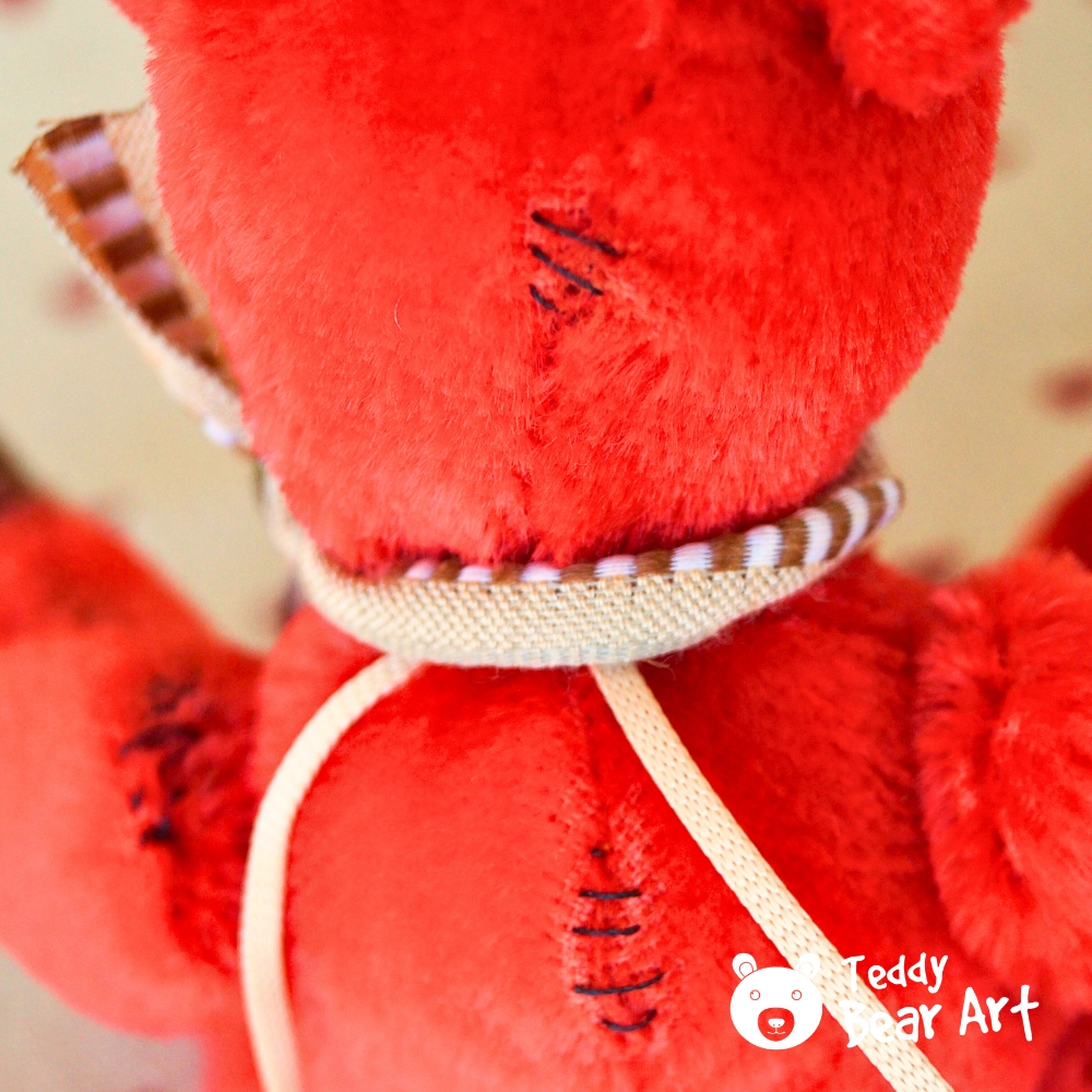 Materials: German mohair, glass eyes. Filled with synthetic filler. Weighted with metal pellets. 5 joints.
