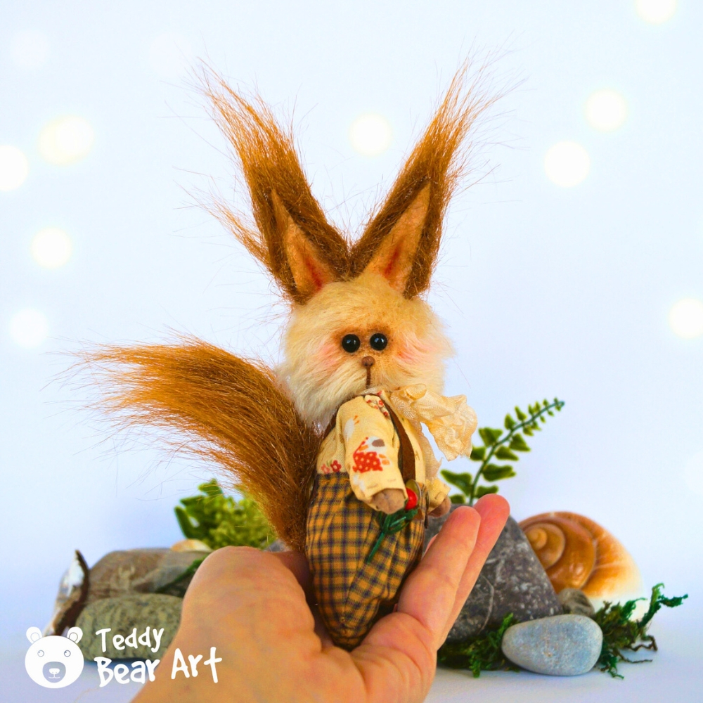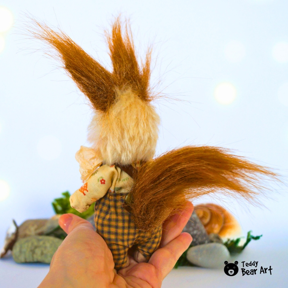 The Squirrel has glass eyes and 3 joints (the head and the arms).